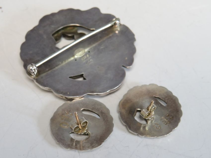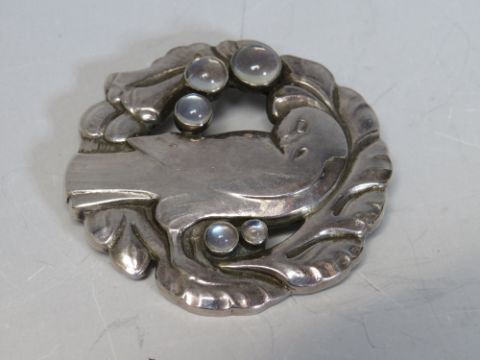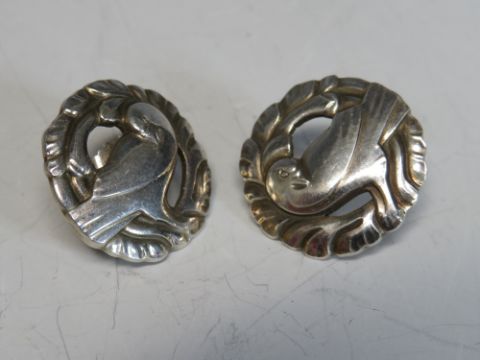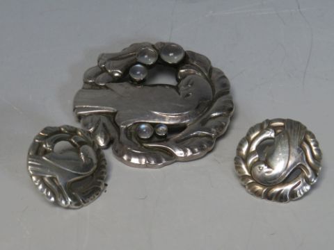 GEORG JENSEN. A George Jensen dove brooch with cabochon moonstone embellishment, stamped 123, together with a pair of matched earrings, stamped 66, both stamped Georg Jensen, 925S Denmark