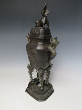 AN EARLY 20TH CENTURY ORIENTAL BRONZED KORO AND COVER, the cover with dog of fu, stylised floral detail throughout, raised on a shaped square base, H 41.5 cm
