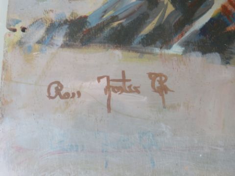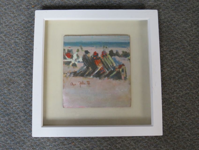 ROSS FOSTER (XX). British school, impressionist beach scene with figures in deck chairs, signed mid to lower left, oil on board, framed and glazed, 20 x 19 cm