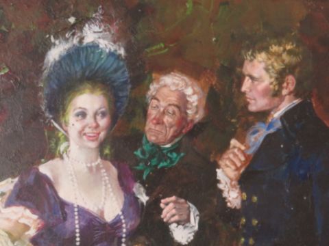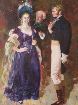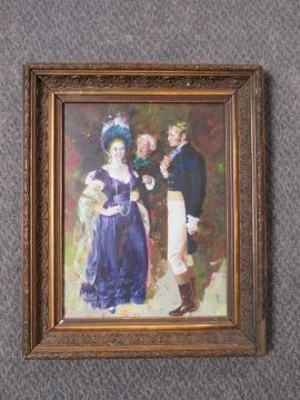 (XIX). British school, an elegant young lady being attended by two gentlemen in Regency dress, unsigned, oil on board, framed and glazed, 36 x 28 cm