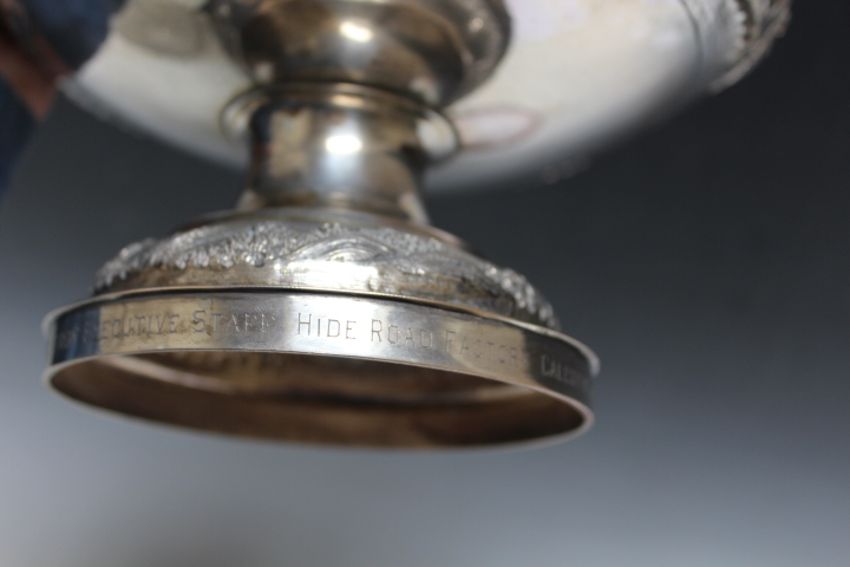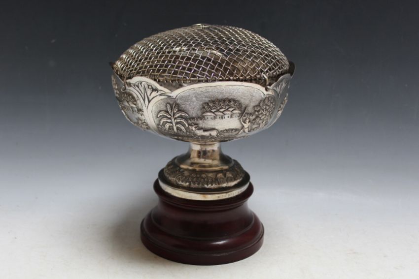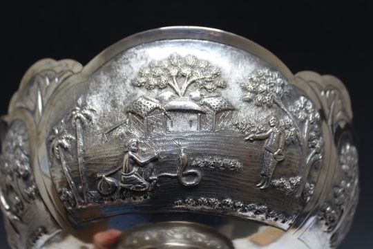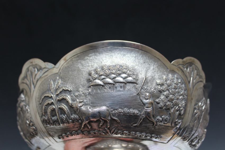 A VERY ORNATE INDIAN WHITE METAL ROSE BOWL ON STAND, with engraving 'With Best Wishes from Executive Staff, Hide Road Factory, Calcutta 1970, approx 550g, Dia 21.5 cm