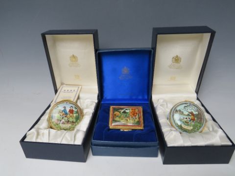 A COLLECTION OF THREE JAMES PURDEY & SONS SHOOTING / COUNTRY PURSUITS HALCYON DAYS ENAMEL PILL BOXES, comprising 'Game Shooting' and 'Duck Shooting' with James Purdey I 1784 - 1863 founder of the firm of James Purdey & Sons Gunmakers inscription to inside of lid, plus a rectangular box with design after an 18th century engraving 'Pheasant Shooting' in the collection of James Purdey & Sons gunmakers (3)