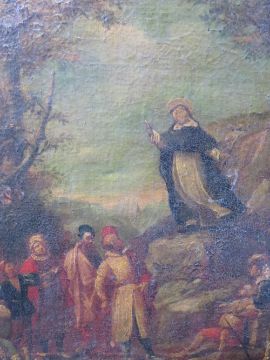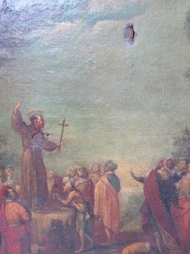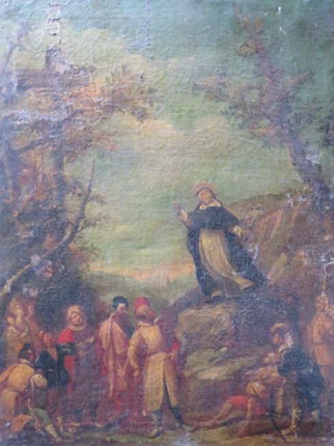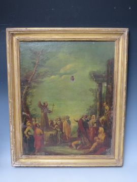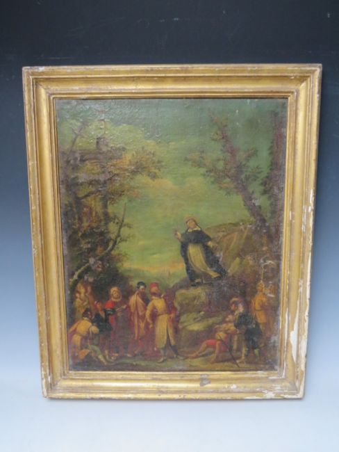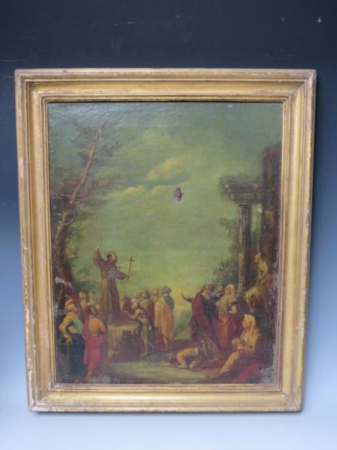 NORTH ITALIAN SCHOOL (XVIII). Saint Dominic preaching and Saint Francis of Assisi preaching, pair of oil on canvas, gilt framed, 48 x 38 cm (2)