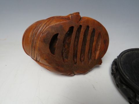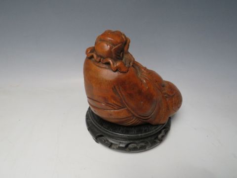 A CHINESE BAMBOO CARVED IMMORTAL, raised on a circular hardwood stand, Figure H 13 cm, W 15 cm