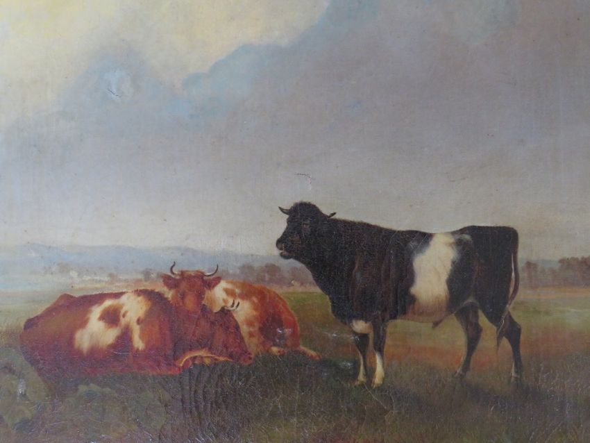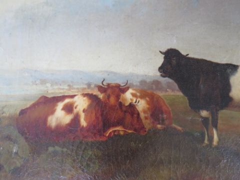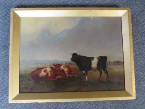 (XIX). British school, cattle resting in a stormy landscape, unsigned, oil on canvas laid on card, framed, 28 x 39 cm