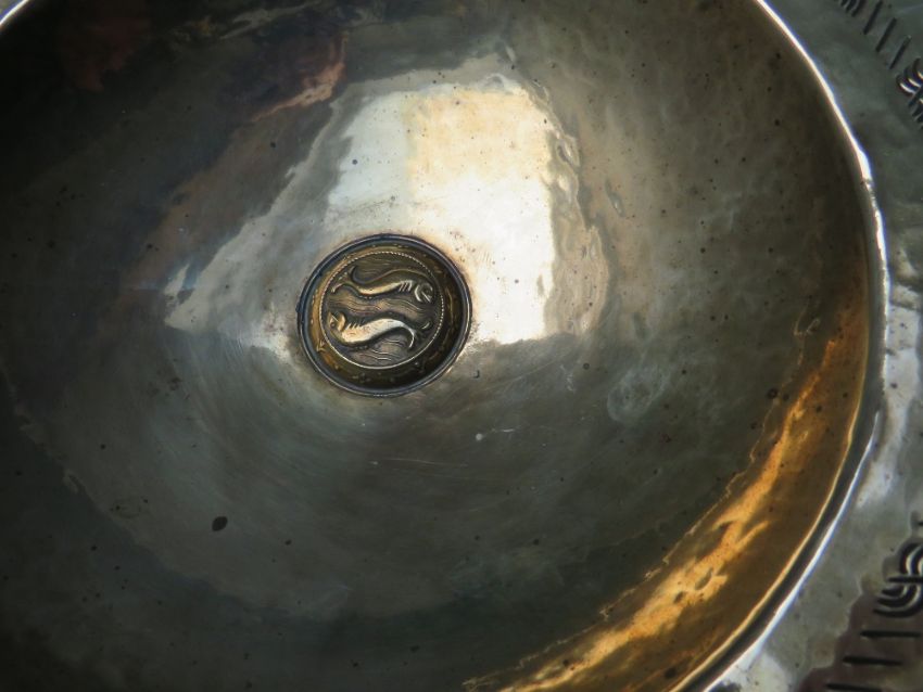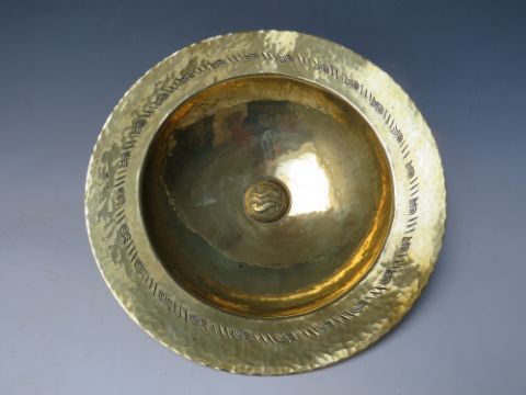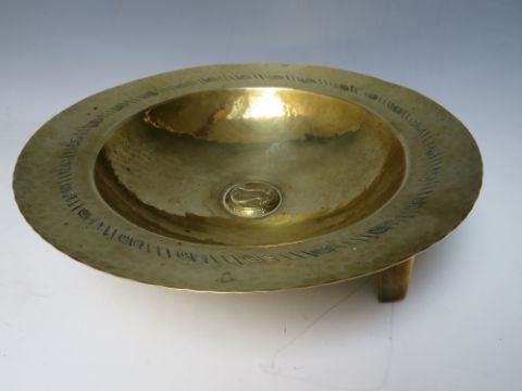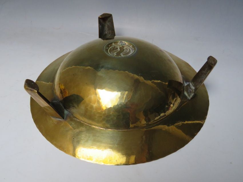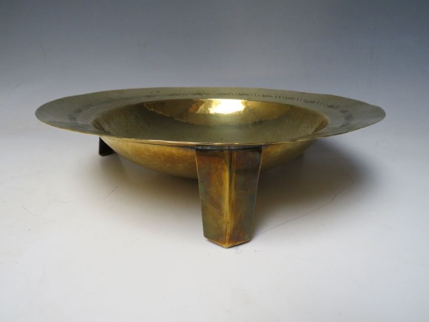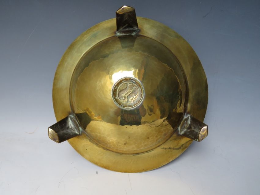 A BRASS ARTS AND CRAFTS FOOTED BOWL, modernist styling with all over hammered finish, central raised cartouche depicting two fish, raised on three applied outsplayed legs, overall Dia.28.2 cm