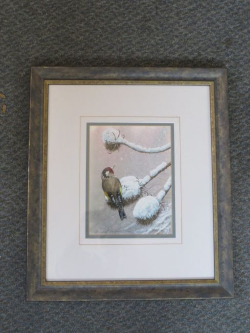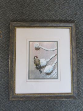 RICHARD WHITTLESTONE (XX). British school, study of a finch perched on a snowy branch, signed lower left, watercolour and gouache on paper, framed and glazed, 20 x 15 cm