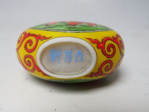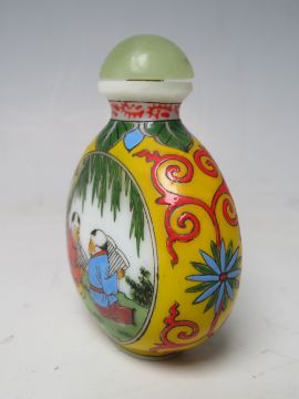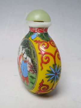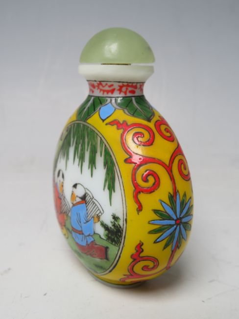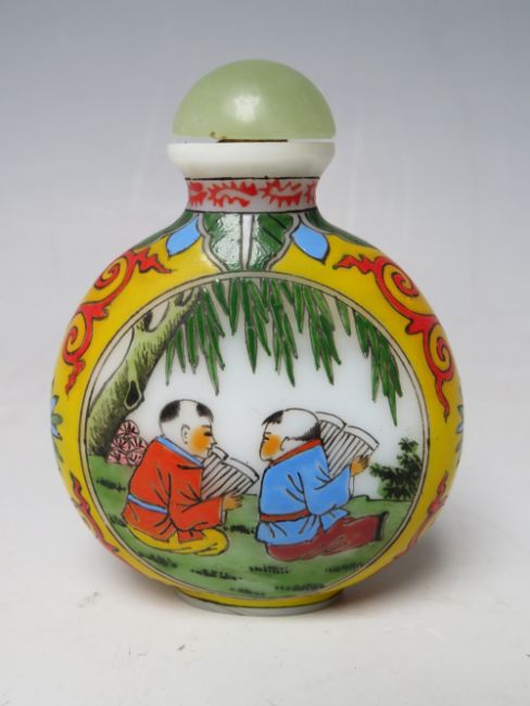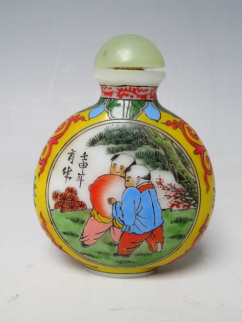 AN ORIENTAL PAINTED GLASS SNUFF, with enamel painted decoration depicting young children studying and playing, character marks to base jade type stopper, H 7.5 cm