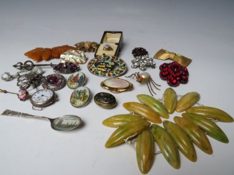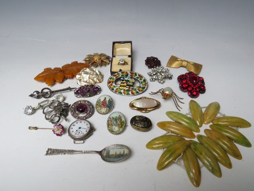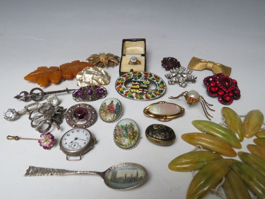 A COLLECTION OF ASSORTED VINTAGE COSTUME JEWELLERY ETC., various styles and periods, to include Scottish hallmarked silver brooch, garnet memorial style brooch, lucite dress clip, vintage lucite bracelet for re-stringing etc