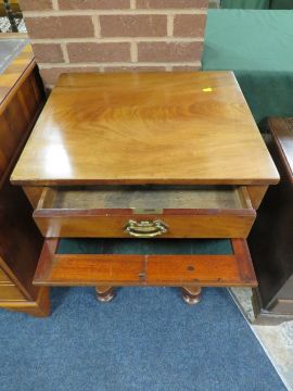 A VICTORIAN MAHOGANY WORK TABLE, having single frieze drawer with pull-out sewing box below, raised on a turned column and quatrefoil base, H 76 cm, W 56 cm