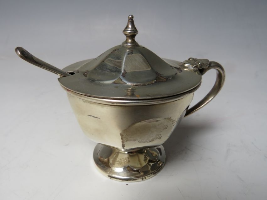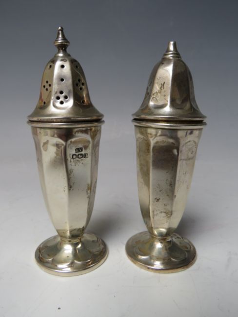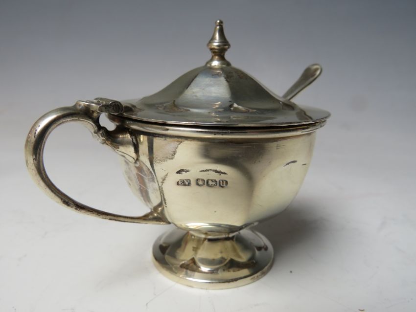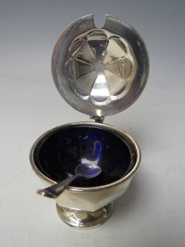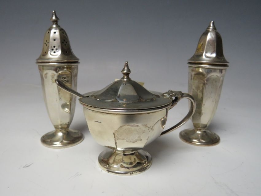 A HALLMARKED SILVER THREE PIECE CRUET SET - SHEFFIELD 1962, makers mark for EV, comprising salt, pepper and mustard, the mustard complete with blue glass liner and matched silver spoon