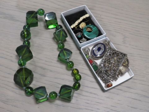 A COLLECTION OF VINTAGE COSTUME JEWELLERY TO INCLUDE A MICHAELA FREY PENDANT LOCKET AND A FACETED GREEN LUCITE TYPE NECKLACE WITH SCREW BARREL FASTENING
