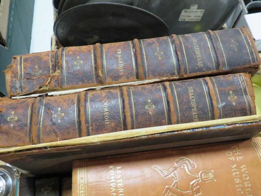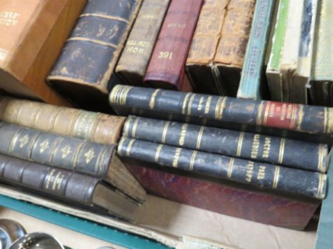 A TRAY OF ANTIQUARIAN BOOKS TO INCLUDE SHAKESPEARE, CHURCH SERVICES ETC