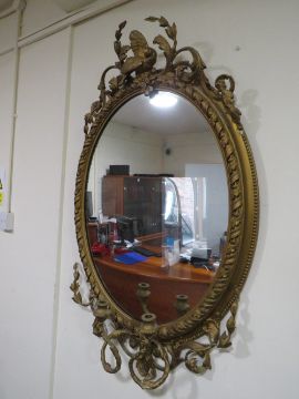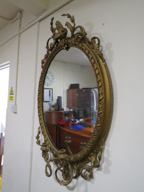 A 19TH CENTURY LARGE GILT OVAL WALL MIRROR WITH TWIN CANDLE SCONCE, having a scrolling foliate detail and bird surmount, H 120 cm, W 72 cm