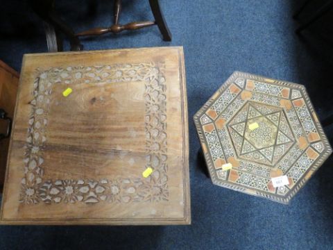 A SMALL EASTERN HEXAGONAL TABLE AND A CARVED HARDWOOD CABINET (2)