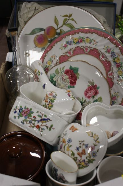 A SMALL TRAY OF ASSORTED CHINA TO INCLUDE ROYAL WORCESTER EVESHAM, WEDGWOOD ETC TOGETHER WITH A TRAY OF RETRO STYLE GERMAN TEAWARE (2)