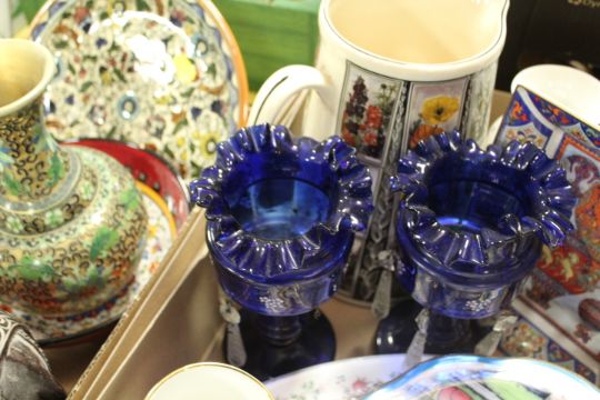 A TRAY OF ASSORTED CERAMICS ETC TO INCLUDE MINTON, AYNSLEY, ROYAL WORCESTER 'FLIGHTS OF FANCY' PATTERN TRINKET DISH TOGETHERWNTIH A SET OF TWO BRISTOL BLUE GLASS SMALL LUSTRES