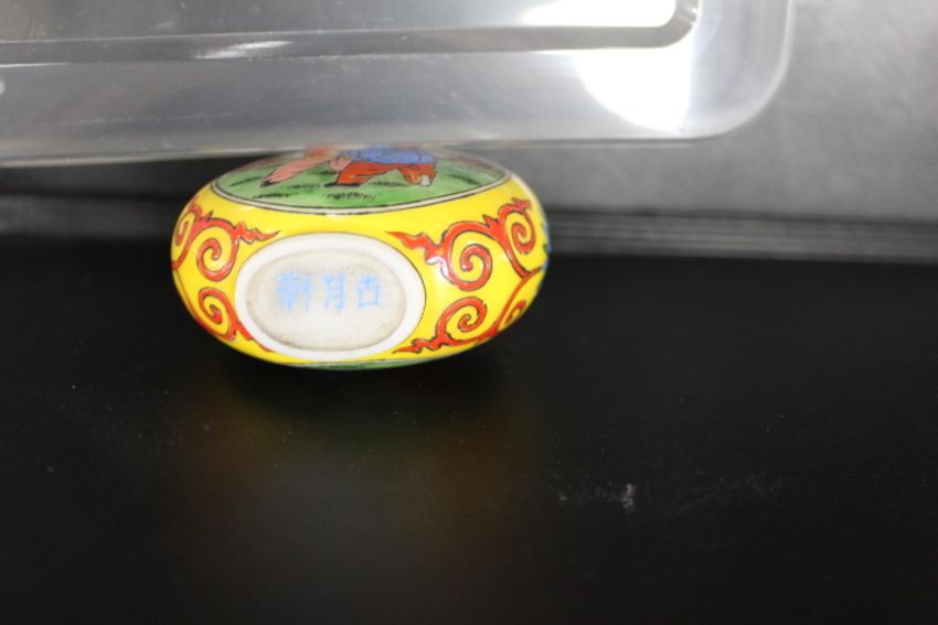 AN ORIENTAL PAINTED GLASS SNUFF, with enamel painted decoration depicting young children studying and playing, character marks to base jade type stopper, H 7.5 cm