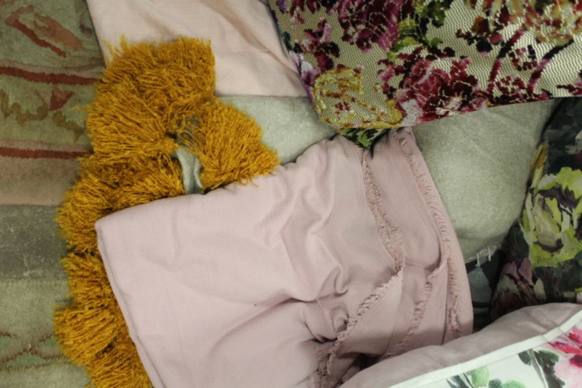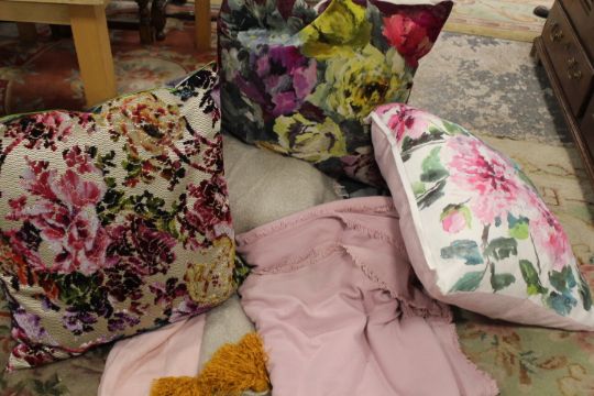 A TRAY OF EX SHOW HOME THROWS TOGETHER WITH TWO DESIGNER GUILD EX LARGE CUSHIONS & ANOTHER