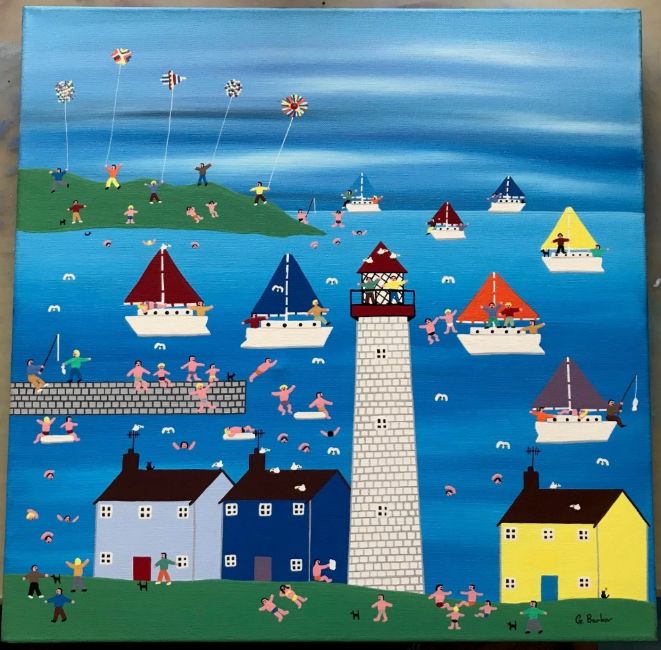 XXI) GORDON BARKER - A MODERN ACRYLIC BOX CANVAS PAINTING 'SEASIDE KITES'