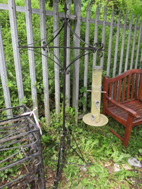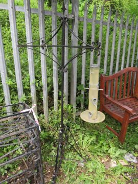TWO LARGE WROUGHT IRON PLANT STANDS, PARASOL BASE, BIRD FEEDER AND TWO OBELISKS (6)