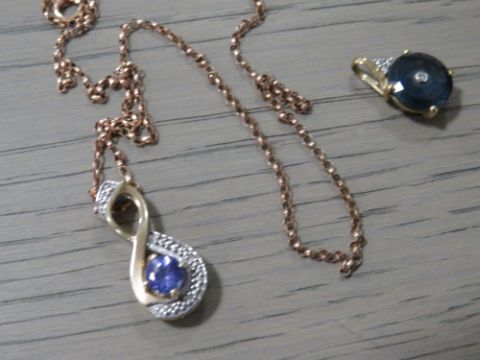 A 10K SMALL CIRCULAR GEM SET PENDANT TOGETHER WITH ANOTHER PENDANT ON ROSE GOLD CHAIN (2)