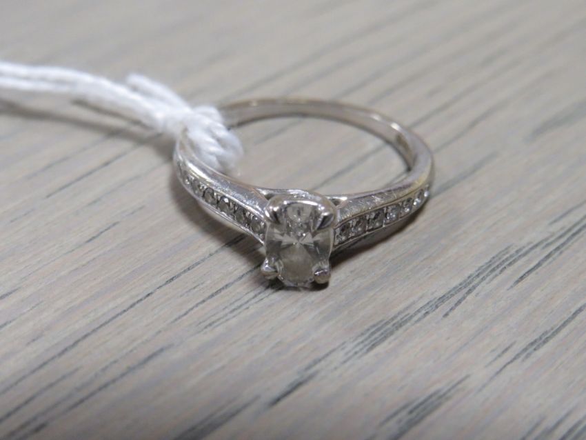 A HALLMARKED 18 CARAT WHITE GOLD OVAL DIAMOND SOLITAIRE RING, the central diamond being an estimate half carat enhanced with seven diamond accents to each shoulder, approx weight 2.1g, ring size J