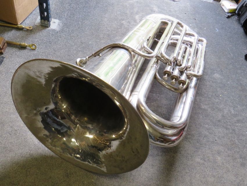 A VINTAGE SILVER PLATED TUBA - 'THE PROFUNDO 6086' - HAWKES AND SON MAKERS, DENMAN STREET, LONDON