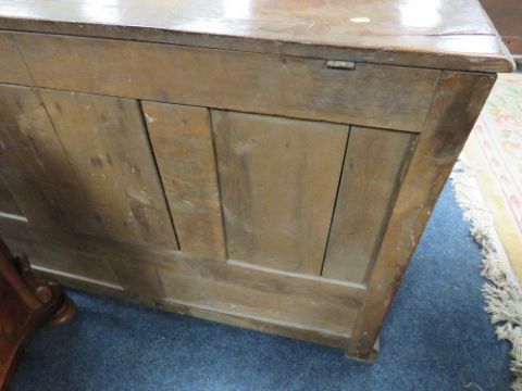 AN OAK MULE CHEST, the hinged lid above a fielded triple panel front with two drawers below, raised on bracket feet, H 84 cm, W 128 cm, D 55 cm