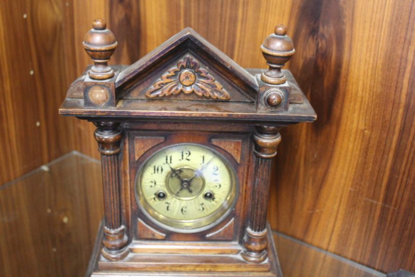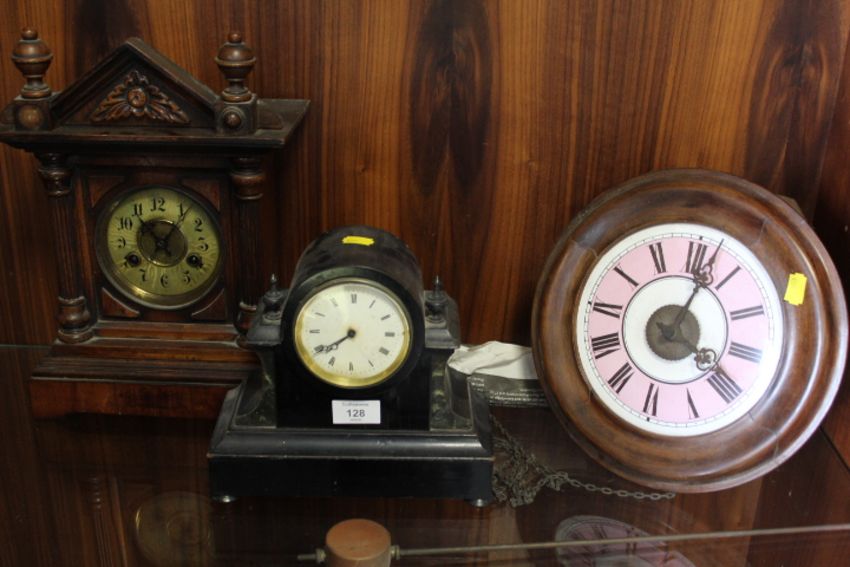 A VINTAGE MAHOGANY CASED POSTMANS WALL CLOCK - INCLUDING TWIN WEIGHTS AND PENDULUM, A VINTAGE ARCHITECTURAL CASED MANTLE CLOCK TOGETHER WITH ANOTHER CLOCK (3)
