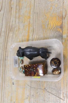 A COLLECTORS LOT - to include a tortoiseshell lidded box, Tunbridge ware thimble holder, Art Deco figure of a dog, scarab beetles etc. (Approx 9)