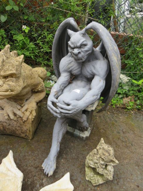 A HEAVY STONE GARGOYLE H-46 CM WITH OTHER STONE AND PLASTIC ORNAMENTS
