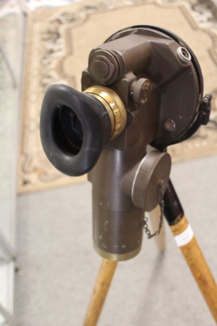 A VINTAGE SURVEYING TELESCOPE / GUN SIGHT ON FOLDING TRIPOD STAND