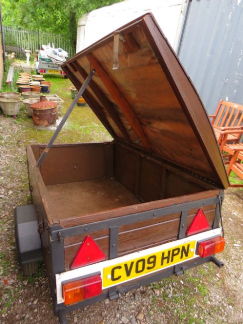 A SMALL OLD TWO WHEEL CAR TRAILER WITH TAILBOARD