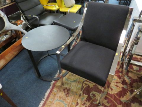 A MODERN BLACK AND CHROMED ARMCHAIR WITH BLACK METAL TABLE (2)