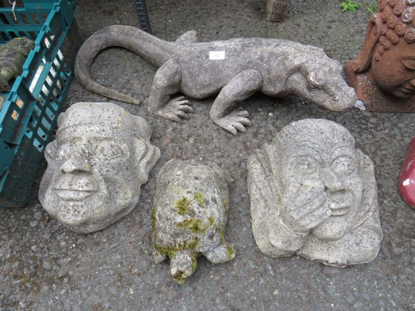 A COLLECTION OF ASSORTED GARDEN ORNAMENTS TO INCLUDE TWO BUDDHA HEADS ( NOT STONE ) FACES MASKS LIZARD ETC