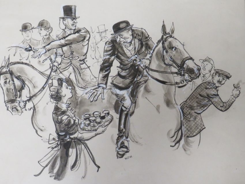 W.O.W. (XX). A hunting cartoon/caricature, initialled lower centre, pen and ink, framed and glazed, 28.5 x 37.5 cm
