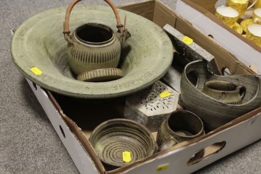 A TRAY OF STUDIO POTTERY TOGETHER WITH A TRAY OF TEAWARE