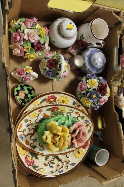A TRAY OF ASSORTED CERAMICS TO INCLUDE GINGER JARS
