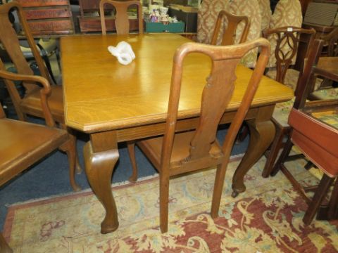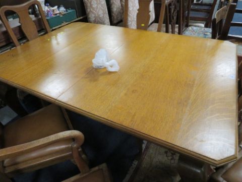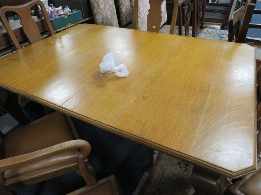 AN EARLY 20TH CENTURY OAK EXTENDING DINING TABLE WITH A SET OF SIX CHAIRS