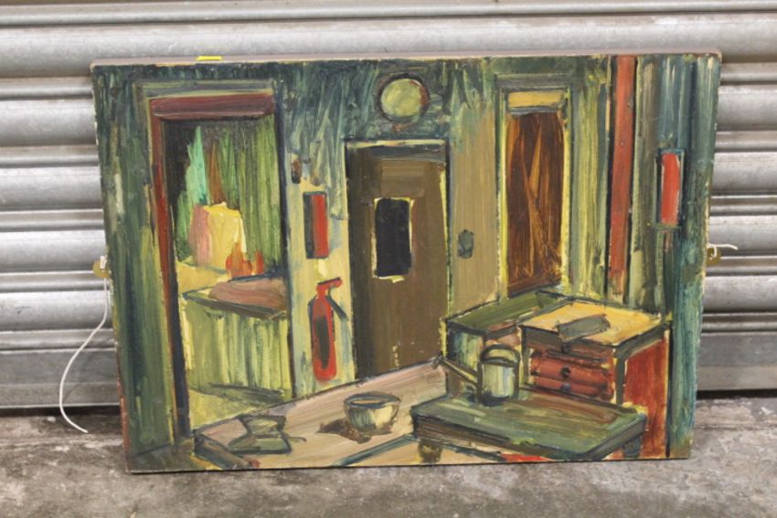 AN IMPRESSIONIST OIL ON BOARD ENTITLED INTERIOR ART ROOM 1971 BY GEORGE HOLT.