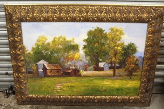 LARGE GILT FRAMED OIL ON CANVAS BUILDINGS IN A RURAL LANDSCAPE, SIGNED LOWER RIGHT