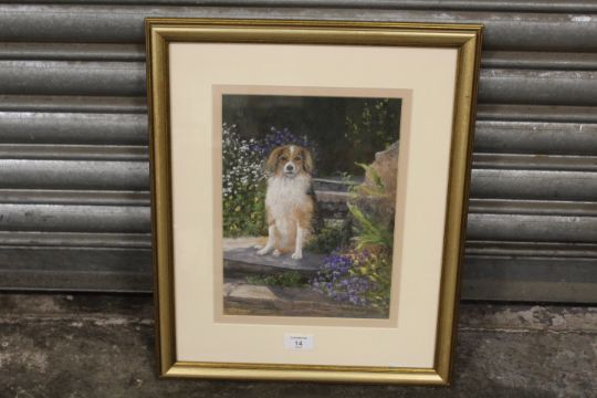 A FRAMED AND GLAZED WATERCOLOUR AND GOUACHE OF A DOG ENTITLED 'JOSHUA' BY JOAN BARNETT - DETAILS VERSO