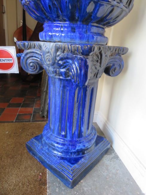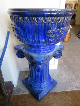 A LARGE MODERN BLUE GLAZED JARDINIERE ON CORINTHIAN COLUMN STAND -OVERALL H 115 cm, Dia. 62 cm