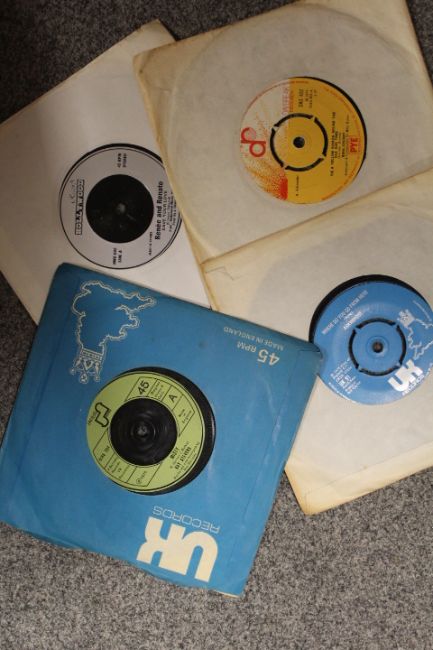 A TRAY OF LP RECORDS, 7" SINGLES, CDs AND CASSETTES