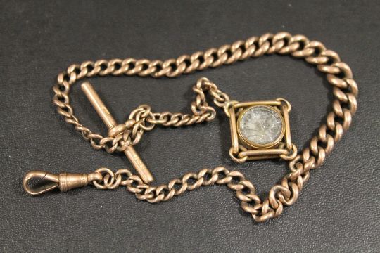 A 9CT ROSE GOLD GRADUATED ALBERT CHAIN WITH BLOODSTONE AND COMPASS FOB A/F - APPROX WEIGHT 36.1 G