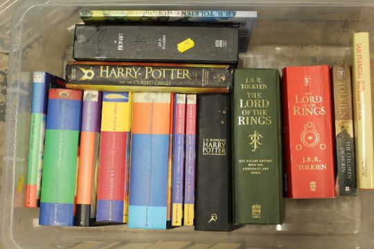 TWO TRAYS OF ASSORTED BOOKS TO INCLUDE HARRY POTTER AND LORD OF THE RINGS