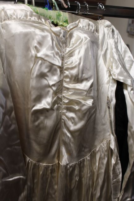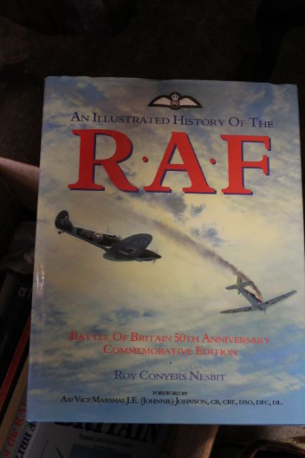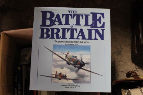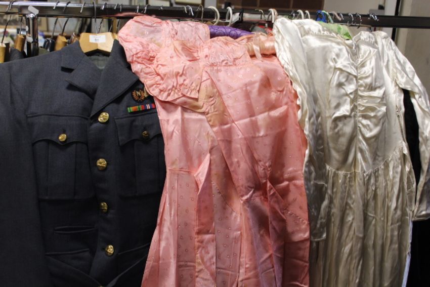 A VINTAGE R.A.F. UNIFORM - TAILORED IN CANADA WITH UNUSUAL BRASS 'CANADIAN GOOSE AND KINGS CROWN' BRASS BUTTONS, TOGETHER WITH A SIMILAR PERIOD WEDDING DRESS AND TWO BRIDESMAID DRESSES, PLUS A BOX OF VINTAGE AIRCRAFT RELATED BOOKS ETC