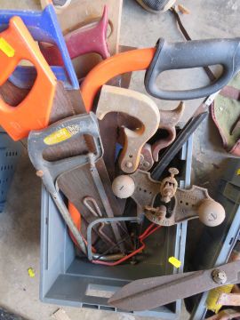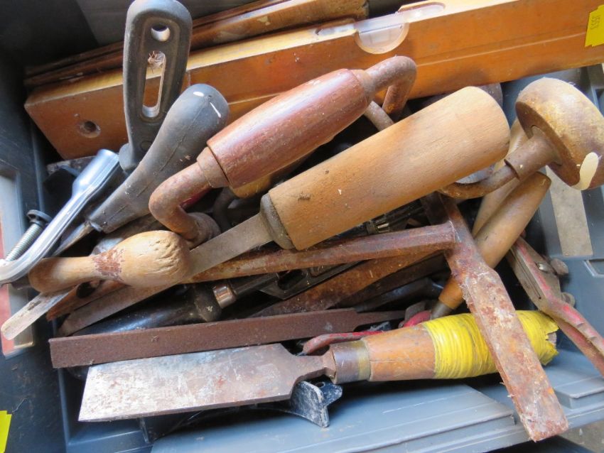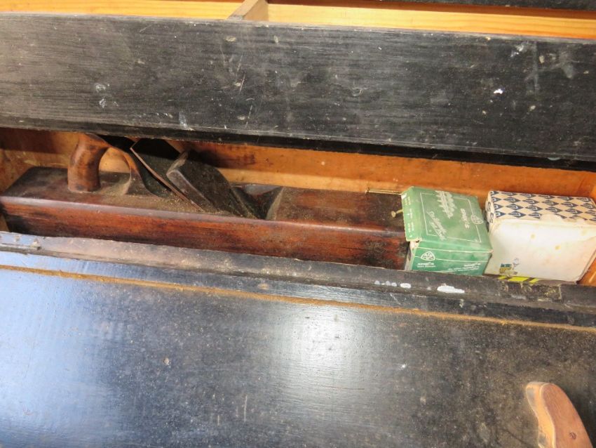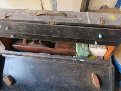 A WOODEN CARPENTERS TOOLBOX WITH CONTENTS TOGETHER WITH THREE TRAYS OF VARIOUS CARPENTRY TOOLS