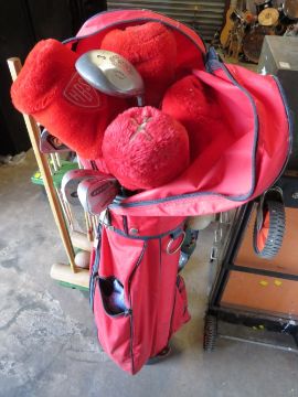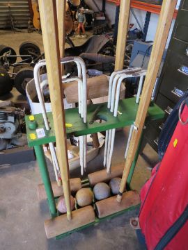A GARDEN CROQUET SET TOGETHER WTIH VINTAGE GOLF CLUBS